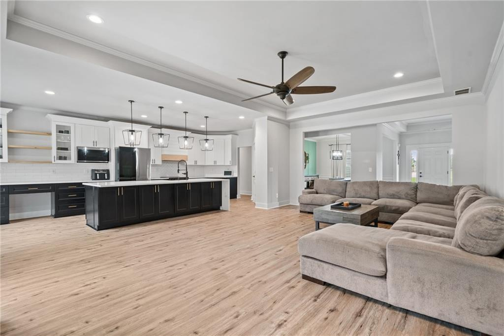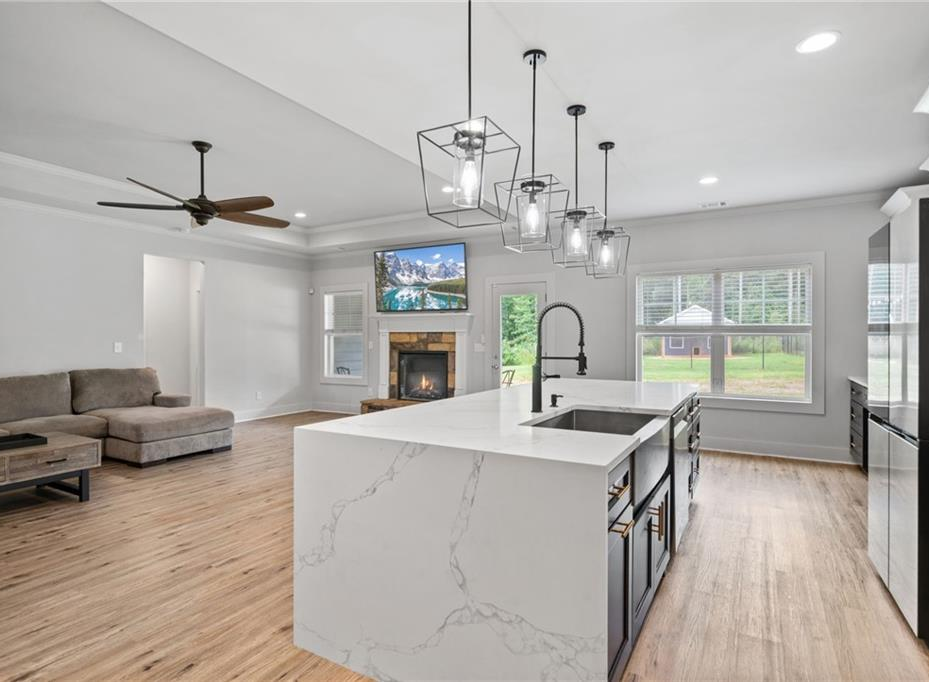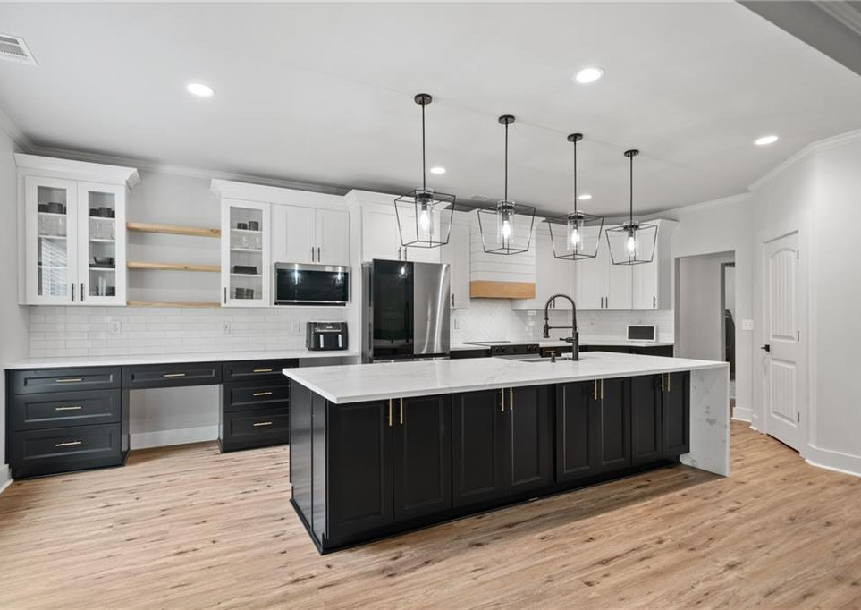 Featuring a BREATHTAKING 13-FOOT TOP OF THE LINE WHITE QUARTZ W A T E R F A L L ISLAND, PREMIUM GRADE TAILOR-MADE CABINETRY, EXQUISITE Gold Fixtures, DESIGNER Pendant lighting, and CUSTOM Built In BAR Cabinets!!, The Kitchen Opens to the HUGE Family Room and boasts a COZY Fireplace, Creating the PERFECT Space for Entertaining. Private DINING ROOM Speaks Volumes in Sophistication.